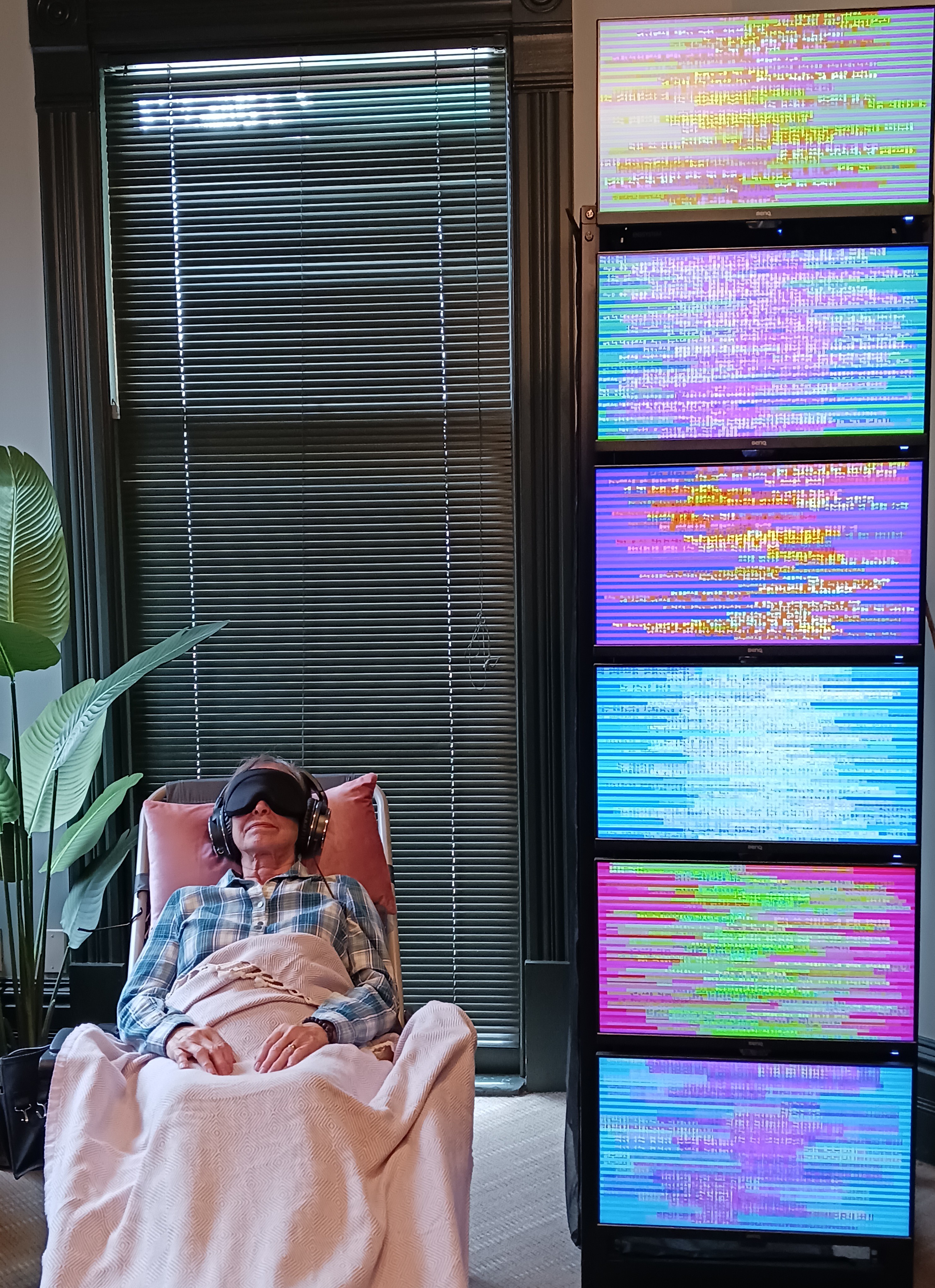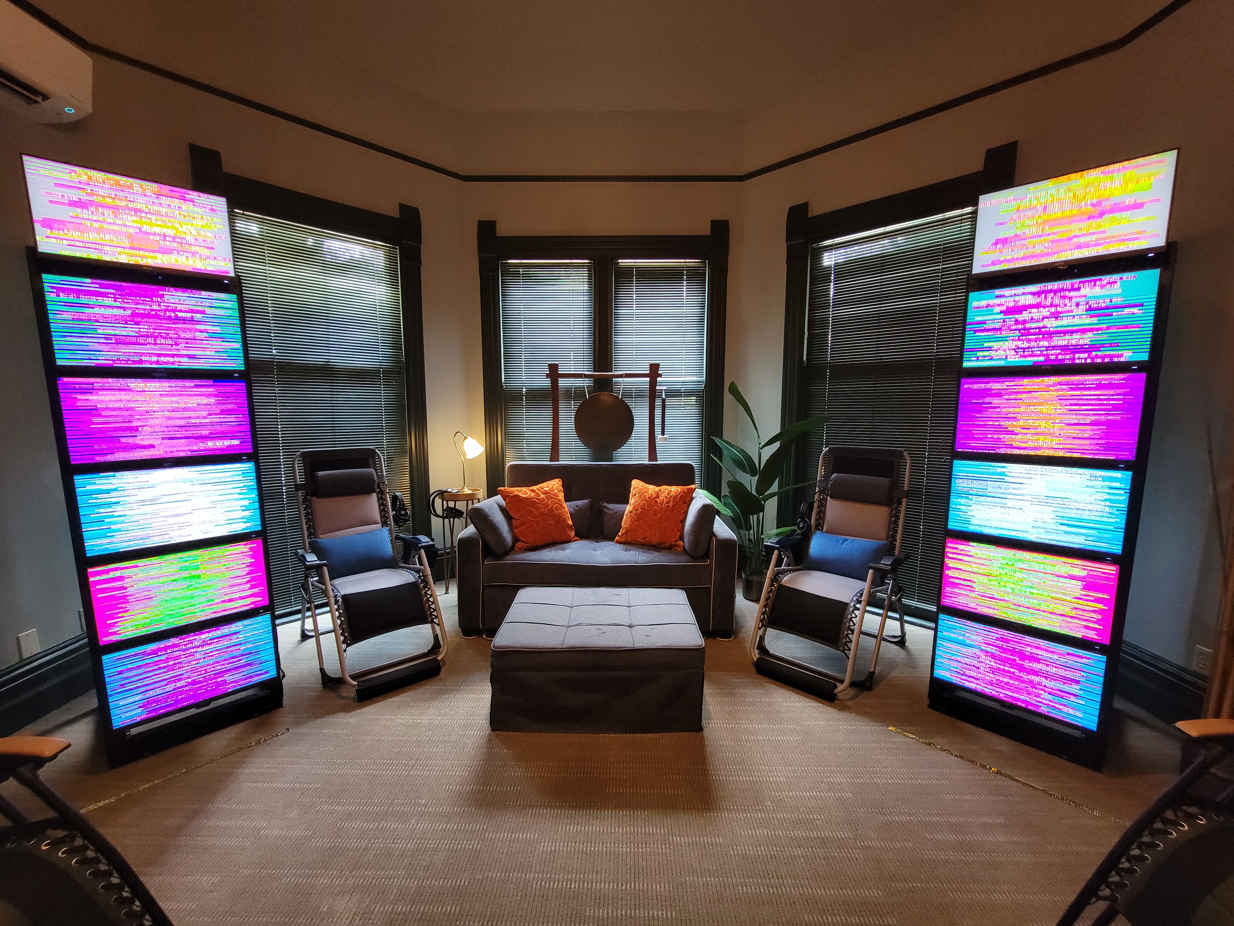 When you come into an EES session you will find a comfortable zero-gravity chair to sit or lie down in. The 24 screens are located in the four corners of the room. Once you get comfortable and close your eyes, you might feel a buzzing energy or you may not notice anything. We offer headsets playing full spectrum bilateral sounds that soothe the nervous system. If you close your eyes, quiet your mind, and relax, you will receive maximum benefit as your mind will move from beta into alpha or theta waves. You will likely feel relaxed and calm. It is not unusual for people to fall into a deep sleep or a deep meditative state, where time slows down or speeds up.